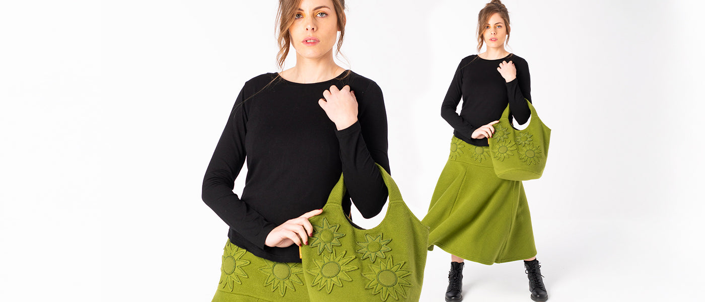 Bolso verde con textura, asas, bolsillo interior, cierre imantado y bordado para un look sofisticado y moderno.