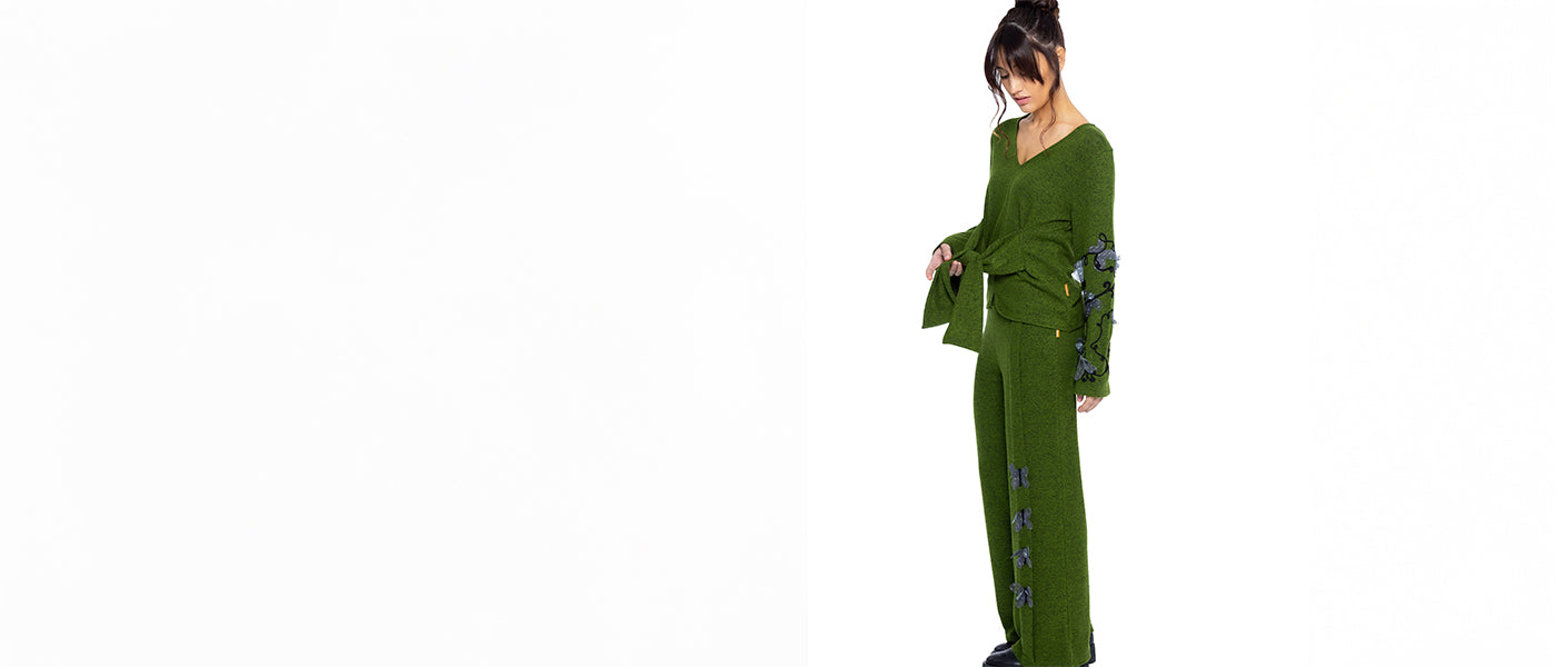 Pantalón fluido realizado en suave punto de hilo torcido en color verde. Tapeta en vertical en una de las perneras y bordado.